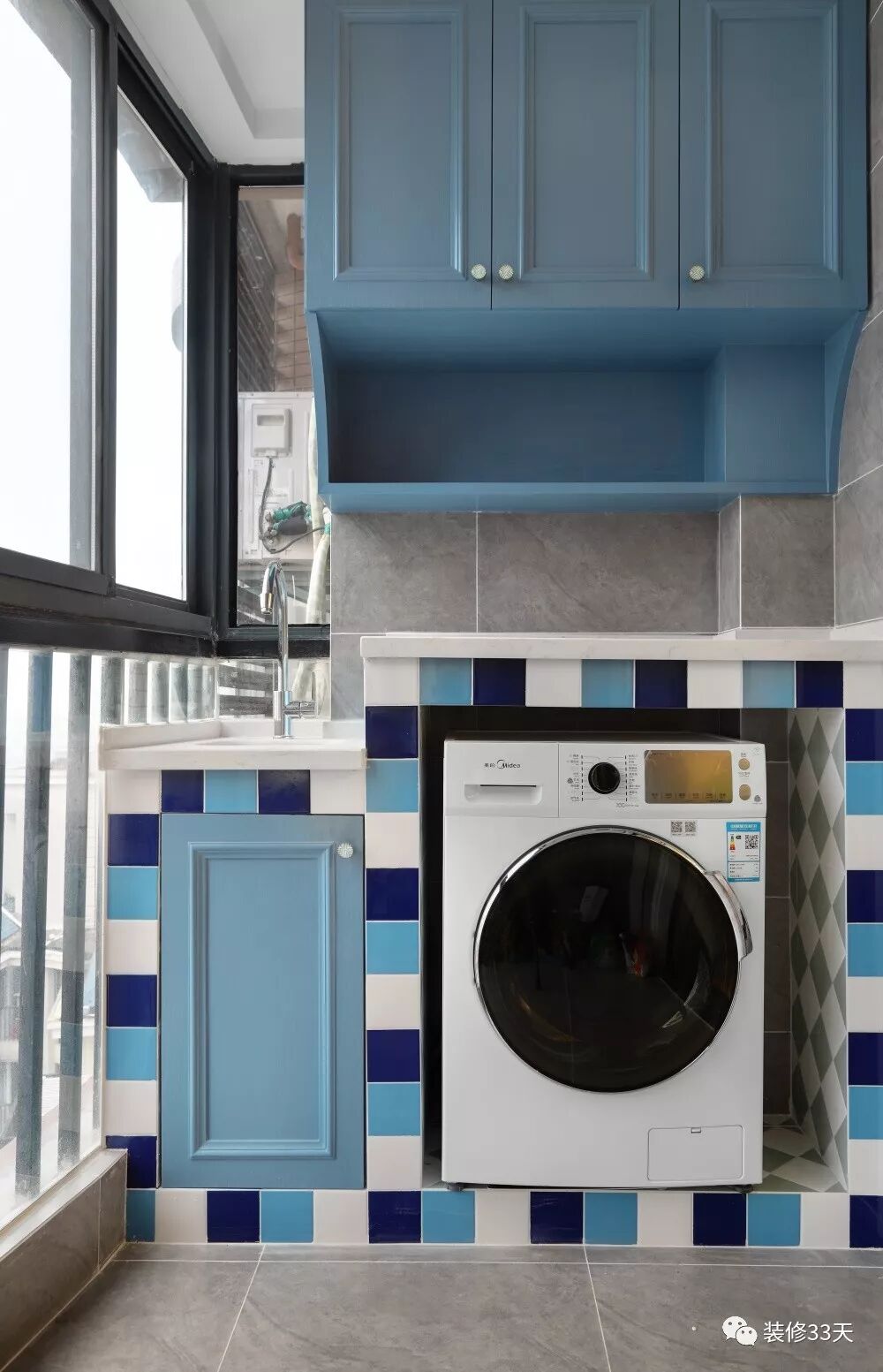 ▲ 阳台延续蓝色基调,错落台面与吊柜设计,美观实用