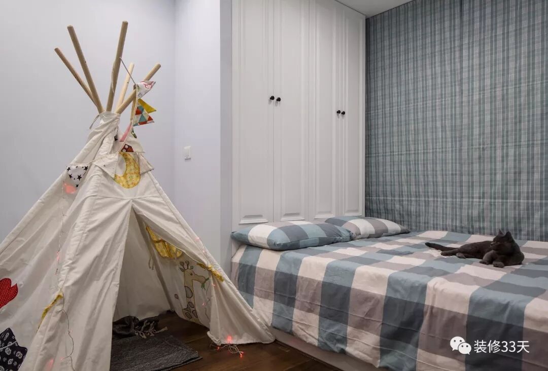▲ 儿童房以蓝灰为基调,木作榻榻米床铺连接柜体,格子床品与窗帘呼应