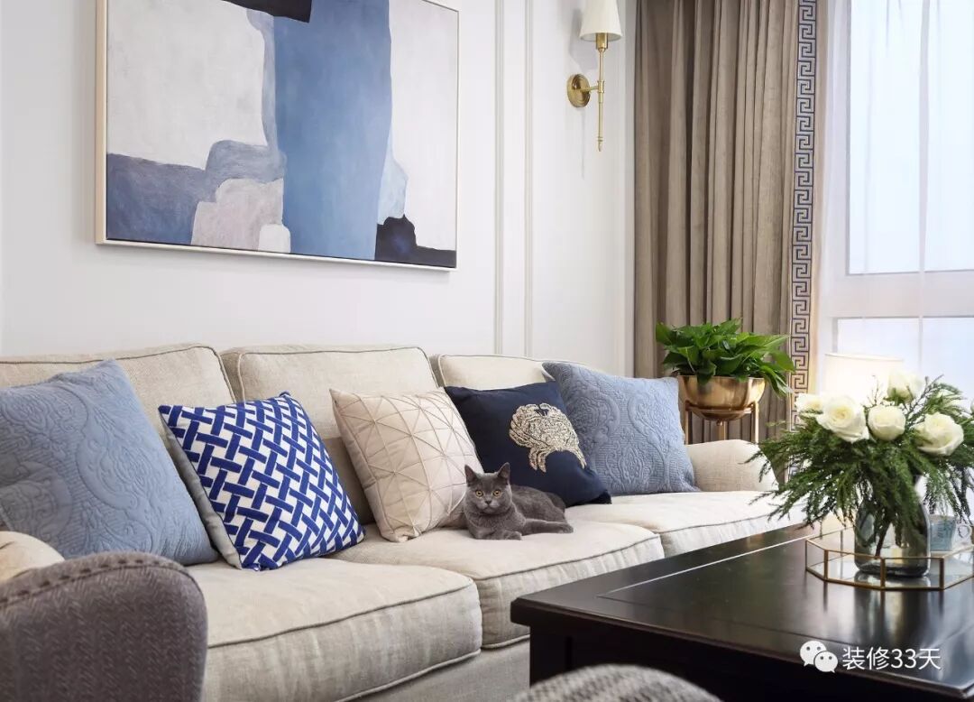 ▲ 米色布艺沙发搭配冷色调的抽象画,点缀蓝色的抱枕,丰富了整个色调
