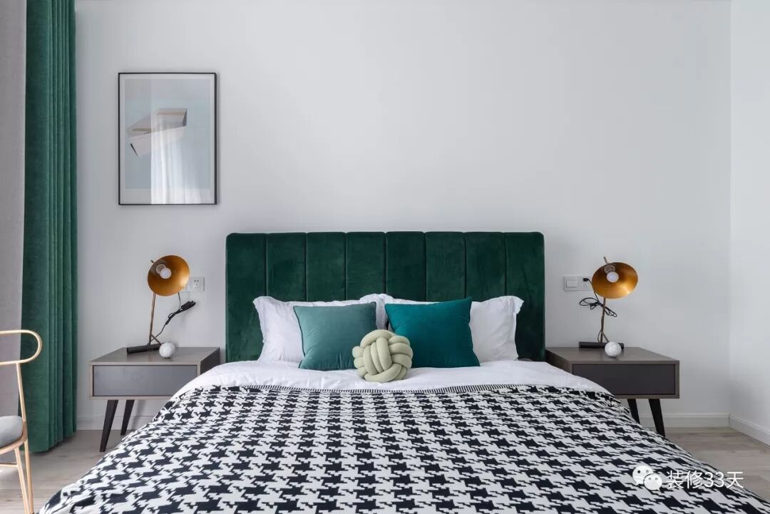 ▲ 主卧地面通铺浅木色地板,留白墙面搭配极简顶面,复古绿大床与拼色窗帘呼应