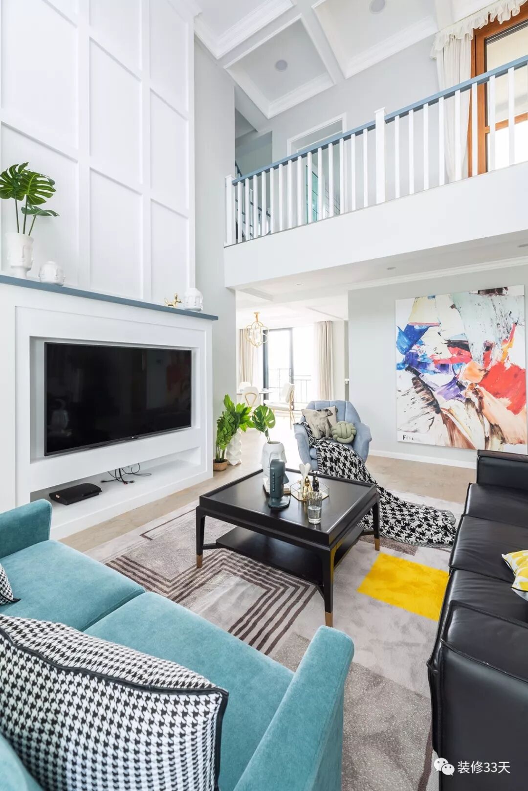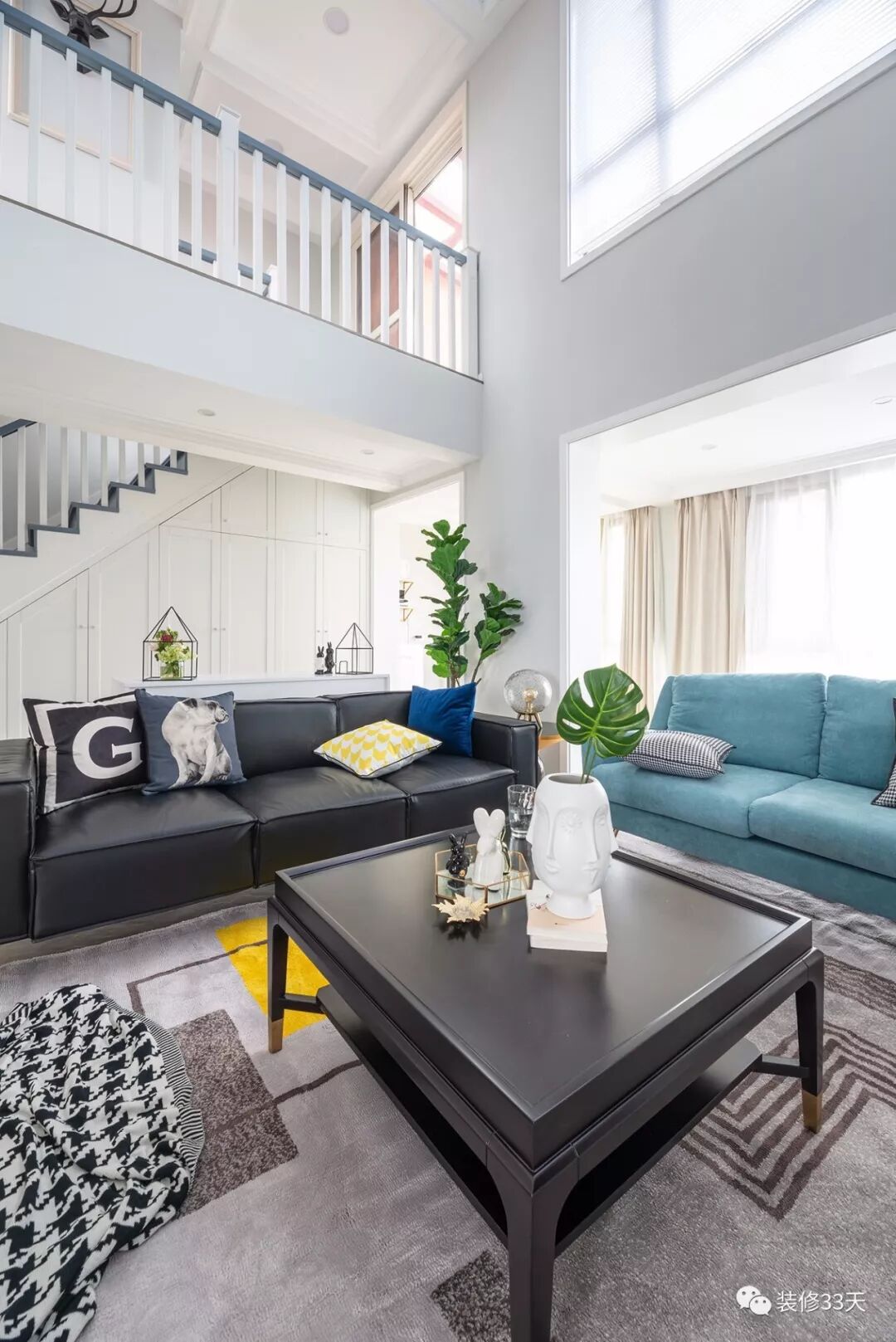 ▲ 挑空客厅以浅色为基调,搭配深色家具,点缀绿植,视觉层次分明