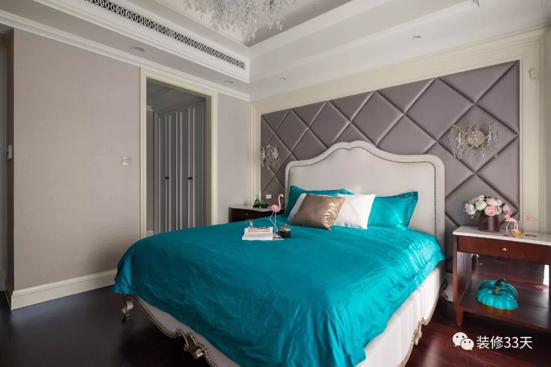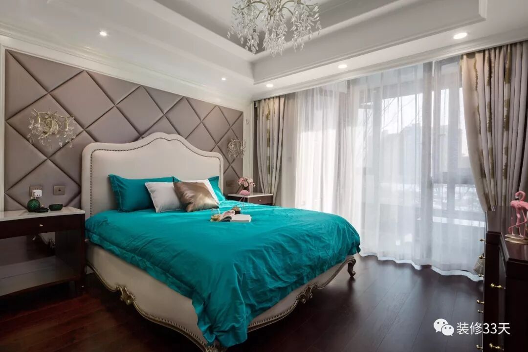 ▲ 原床头软包背景以及地板偏深,家具和窗帘便选择浅色系,空间呈现深浅变化,搭配素净的孔雀蓝床品,贵气十足