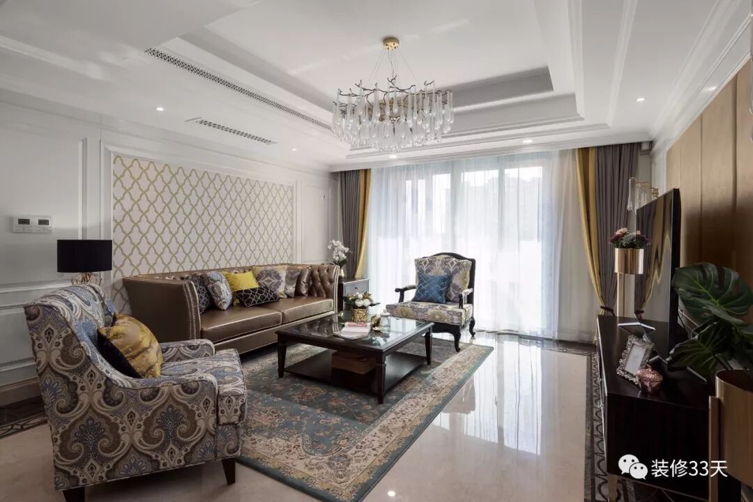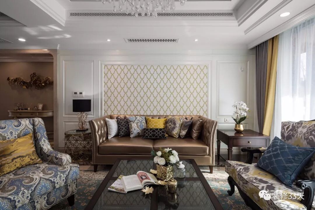▲ 亮棕色皮质沙发,搭配不同款花色单椅,饱满沉稳,墙纸与护墙打造质感背景,时尚大气