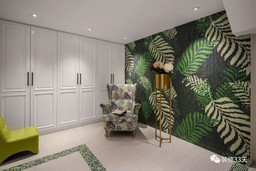 ▲ 负一层储物休闲区,个性时尚的叶片马赛克拼贴墙面充满艺术感,带给人视觉的愉悦与清新感