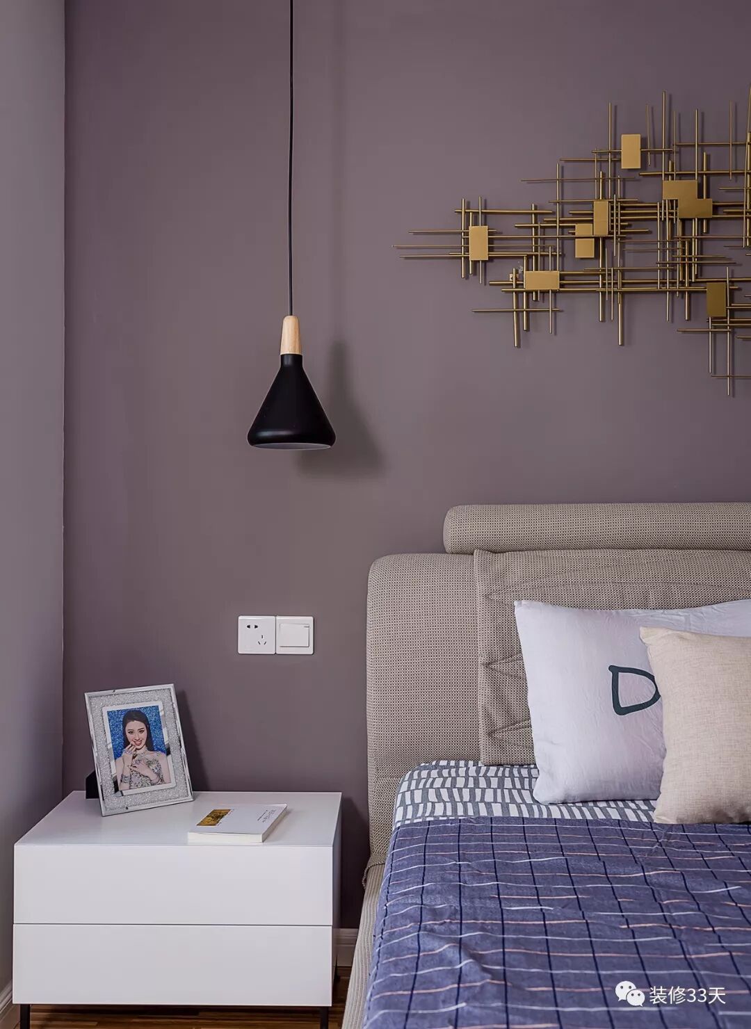 ▲ 褐紫色床背景点缀金色墙饰,卡其色布艺大床与黑色悬挂吊灯,满足舒适性并带些小个性