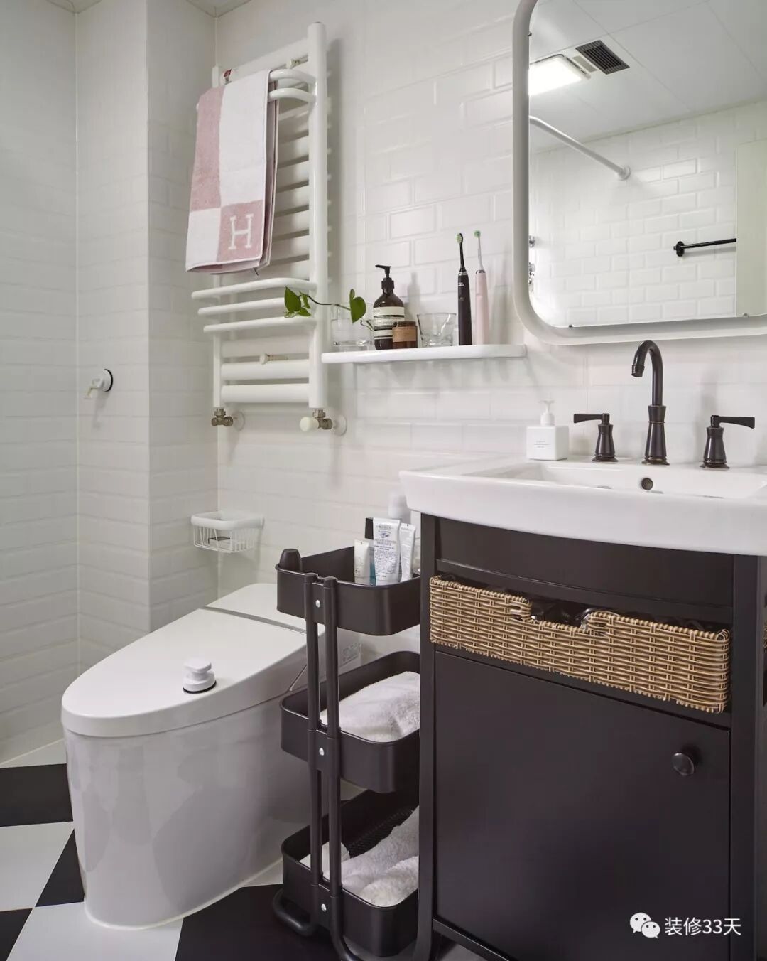 除了挂件,隔板也是很不错的选择。还有,小推车也是不错的收纳补充。上图马桶上面白色的那个是小背篓暖气片,或者也有电热毛巾架有类似功能,可以烘干毛巾保持毛巾干爽,不会发霉。