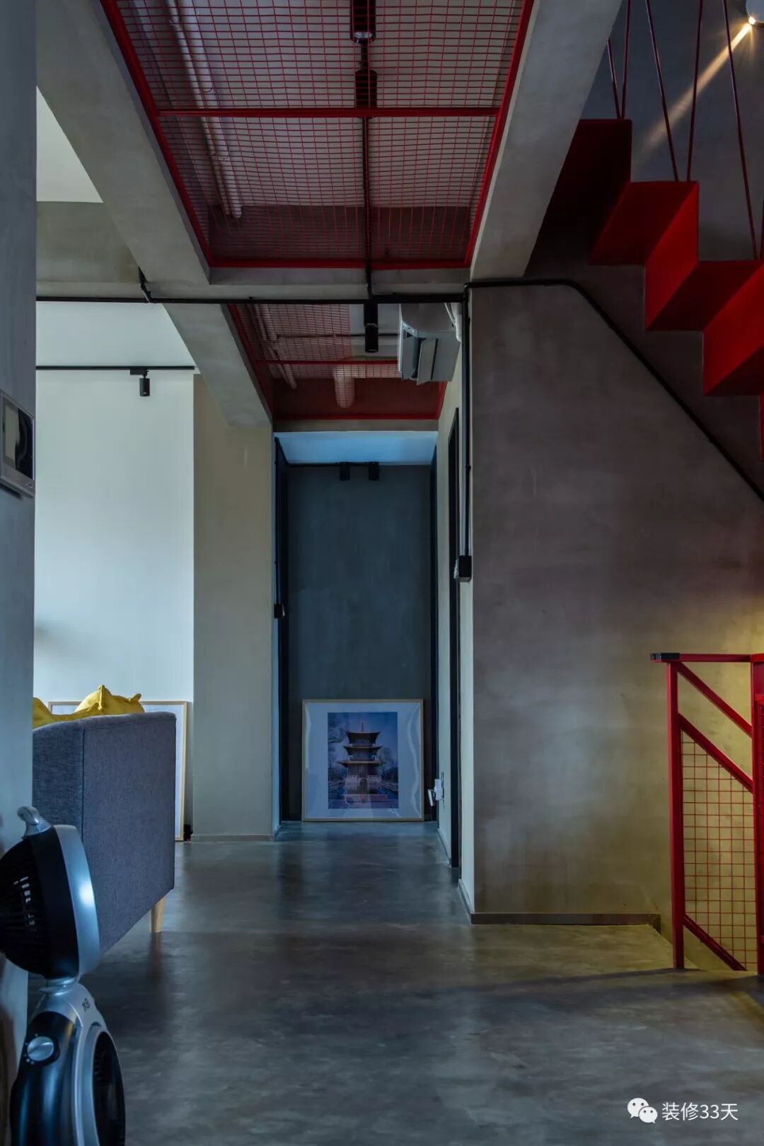 ▲ 二层走廊,延续水泥色地坪与顶面红色铁件吊顶,并以屋主的摄影作品布置端景