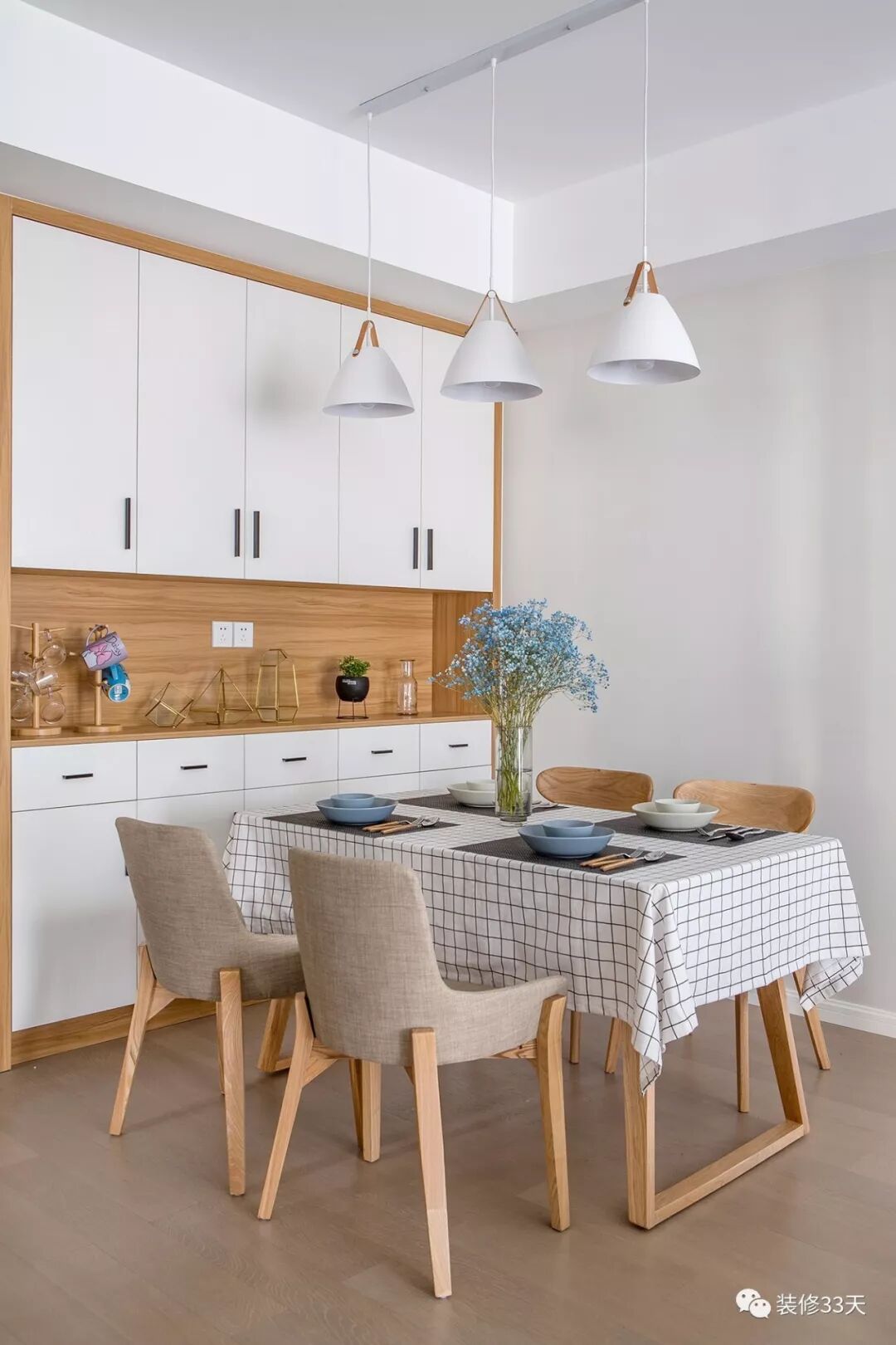 ▲ 入户即见餐厅,网红的拍照桌布,配上宜家淘来的餐具,木色与白色构成自然清新的就餐环境