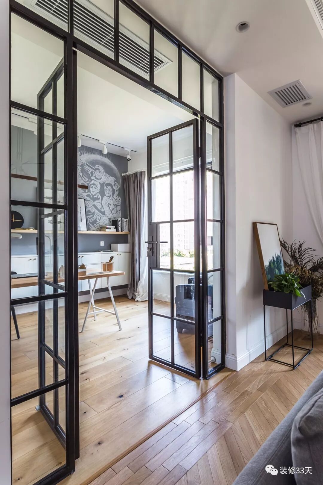 ▲ 客厅后方为书房空间,以黑色金属框玻璃双开门作隔断
