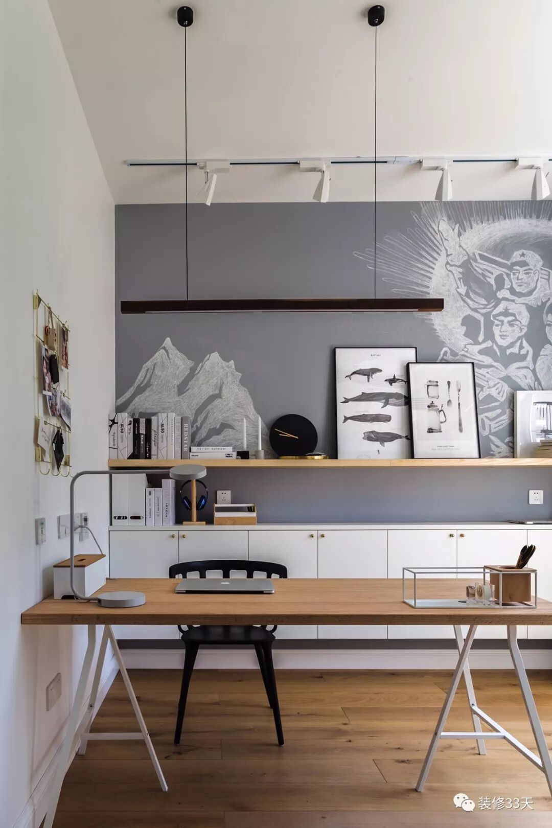 ▲ 书房兼具业主的工作室,灰色墙面结合储物柜体与置物层板作背景,极简的空间让人心无旁骛的工作