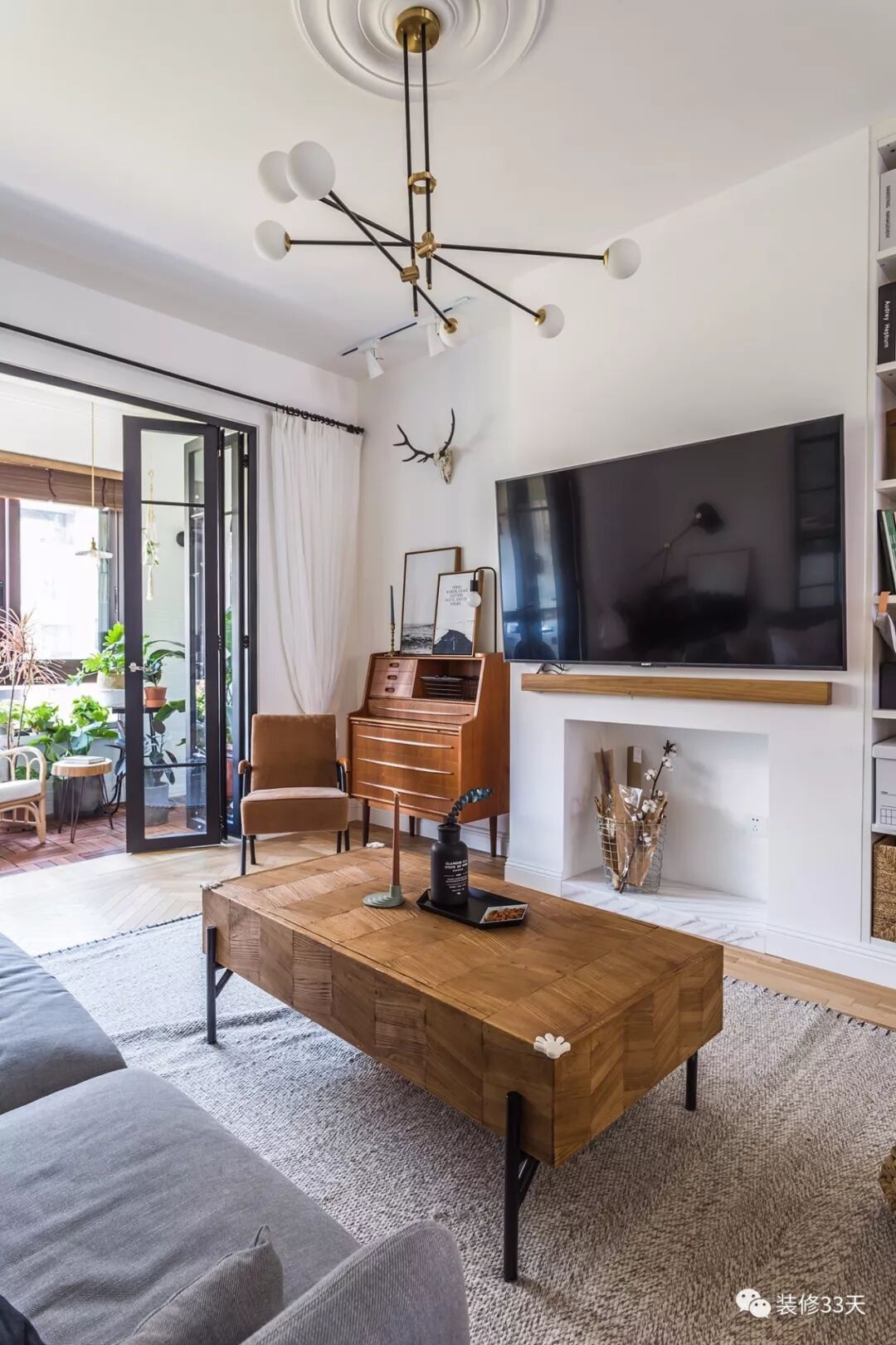 ▲ 客厅延续木色人字铺地面,加铺灰色地毯,整体以大地色系为主色调