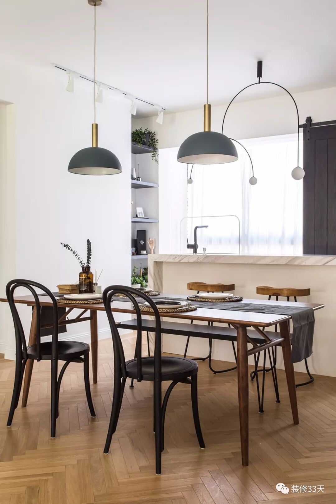▲ 餐厅地面通铺人字铺木地板,深木色餐桌椅搭配长凳,罩灯将光打在食物上,营造就餐氛围