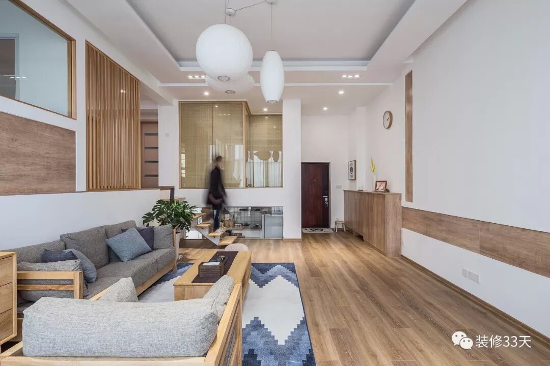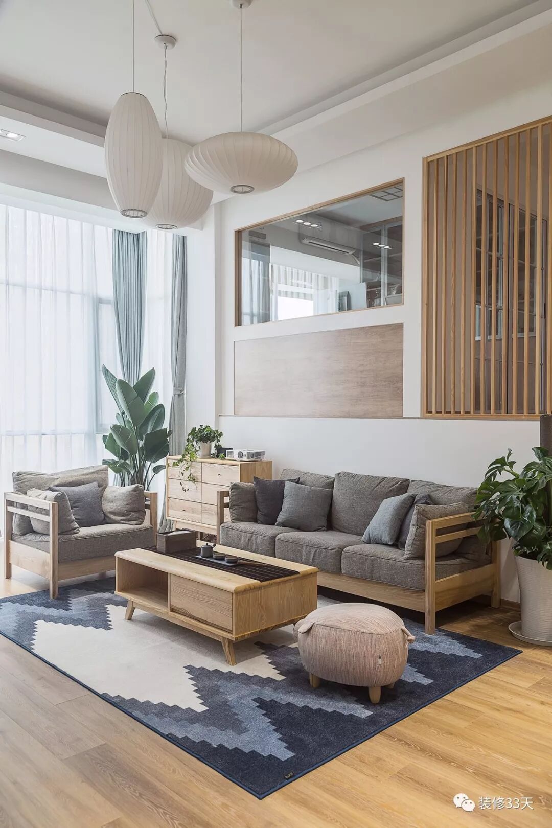 ▲ 木质地板搭配层次感吊顶,装三盏日式吊灯,选择渐变蓝色地毯弥补小体积茶几带来的视觉空白