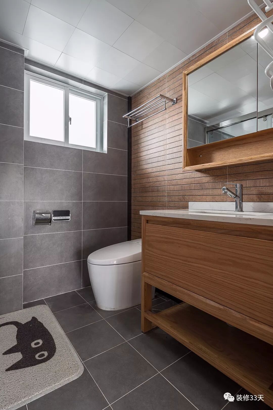▲ 卫生间地面与墙面通铺灰色调瓷砖,搭配大面积木色背景与家具,简洁不失温度