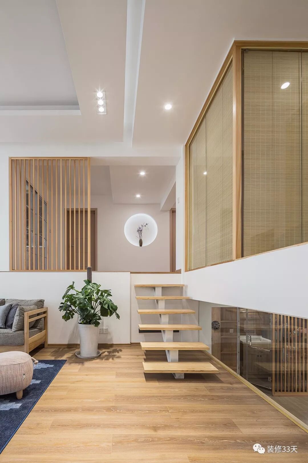 ▲ 木质楼梯清新简洁,整个客厅没有过于繁复的装饰,秉承日式风的简约实用,楼梯右下方错层布置餐厨区域