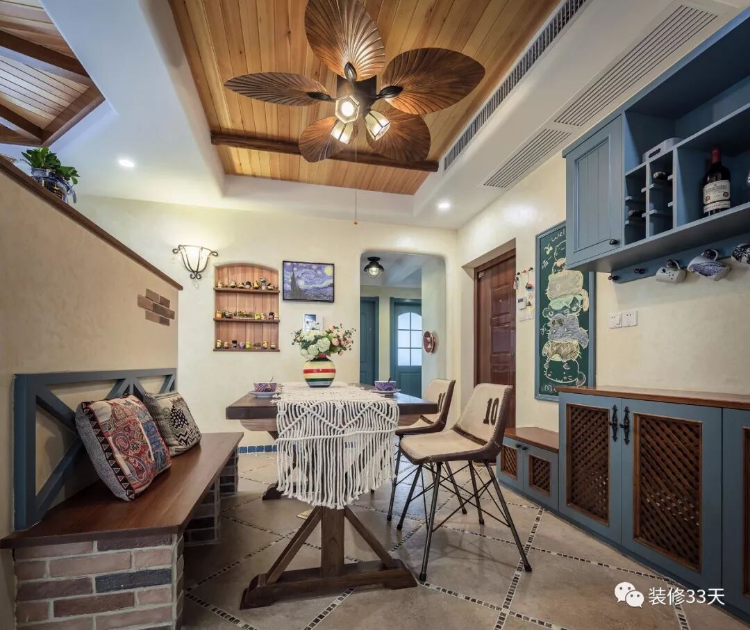 ▲ 卡座餐厅地面斜铺复古砖加马赛克,木质吊顶点缀吊扇灯,美观实用