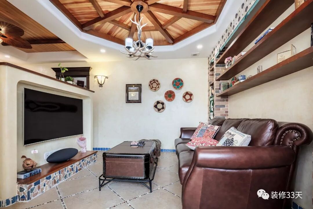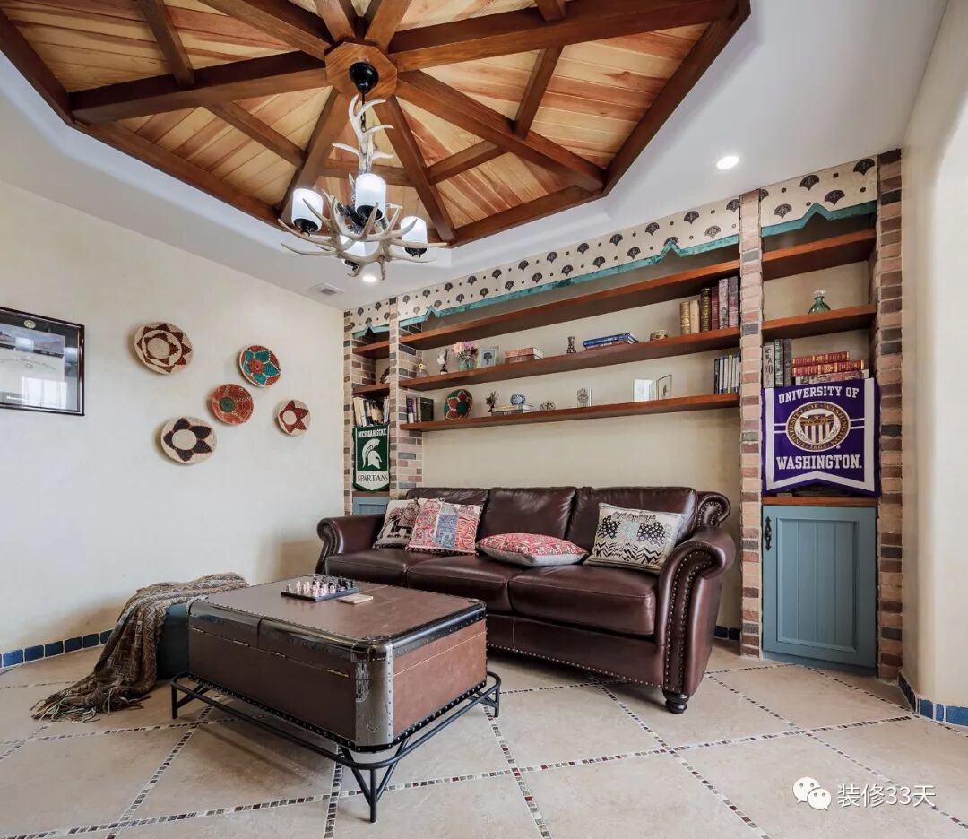 ▲ 客厅地面与墙面延续餐厅的格调,复古家具搭配自砌置物背景墙