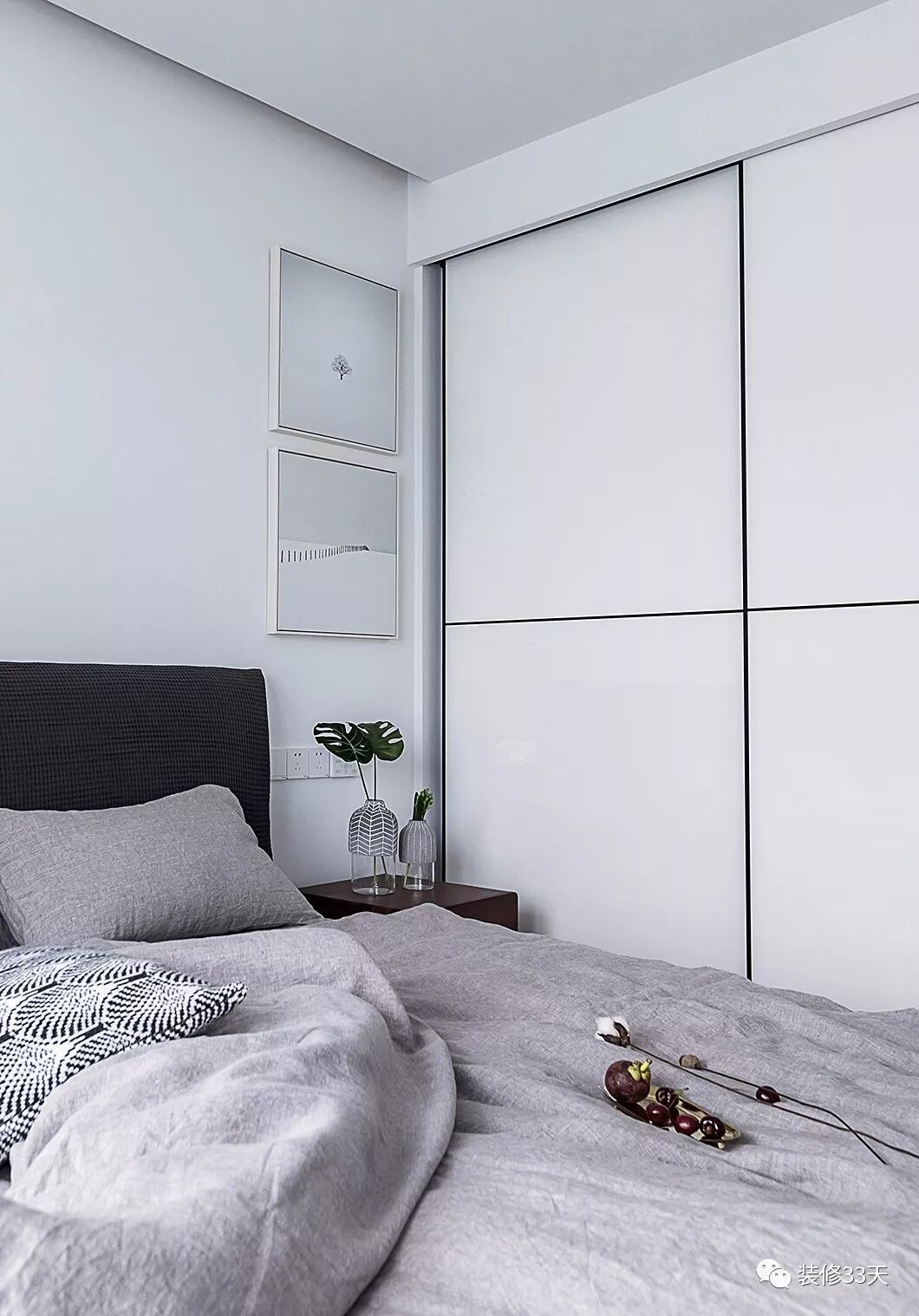 ▲ 线条感的装饰画与床品呼应,白色移门衣柜加入木色线条让立面不显呆板