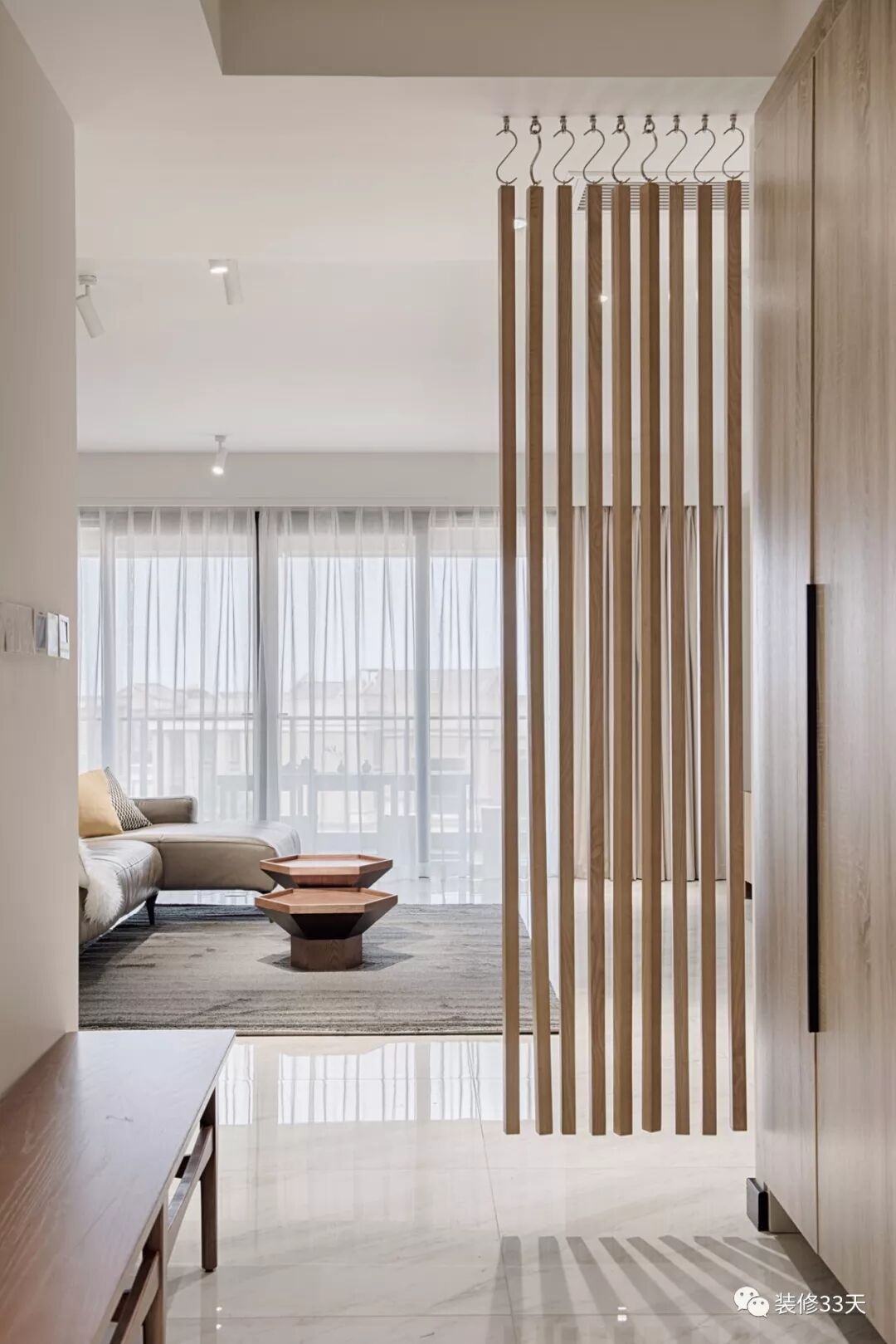 ▲ 测量面积148平, 总造价45万,入户采用悬挂式木条作隔断,独立长条换鞋凳,方便坐下换鞋