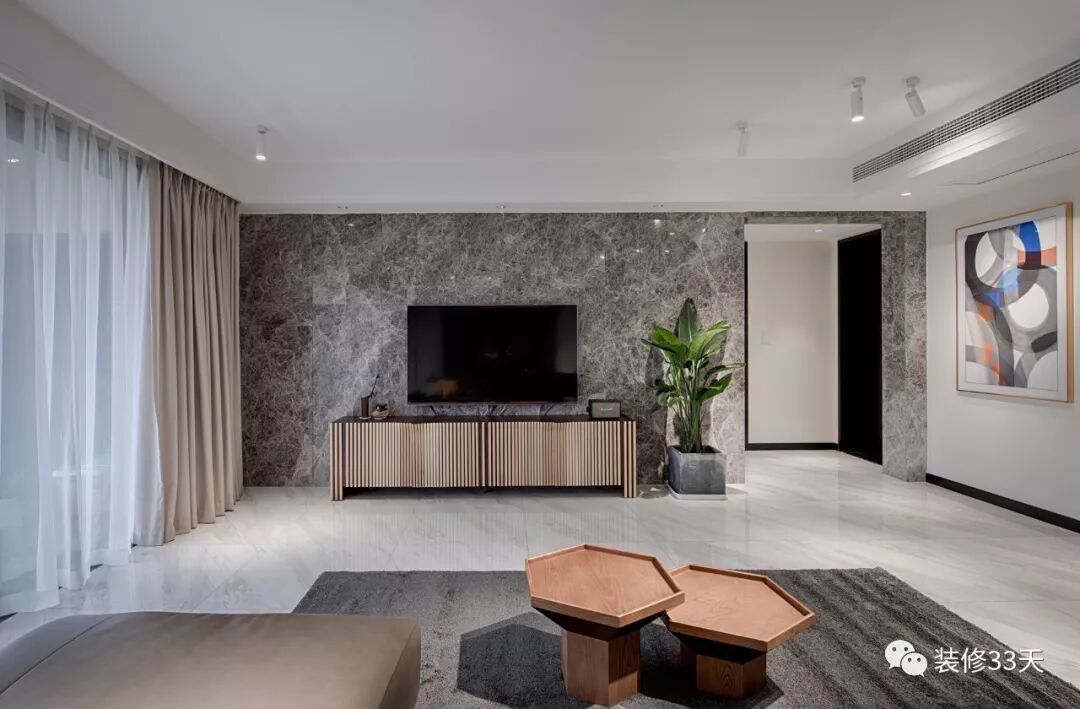 ▲ 石材饰面电视背景墙一直延伸至过道,增强视觉整体性,搭配金色电视柜与绿植,大气简约