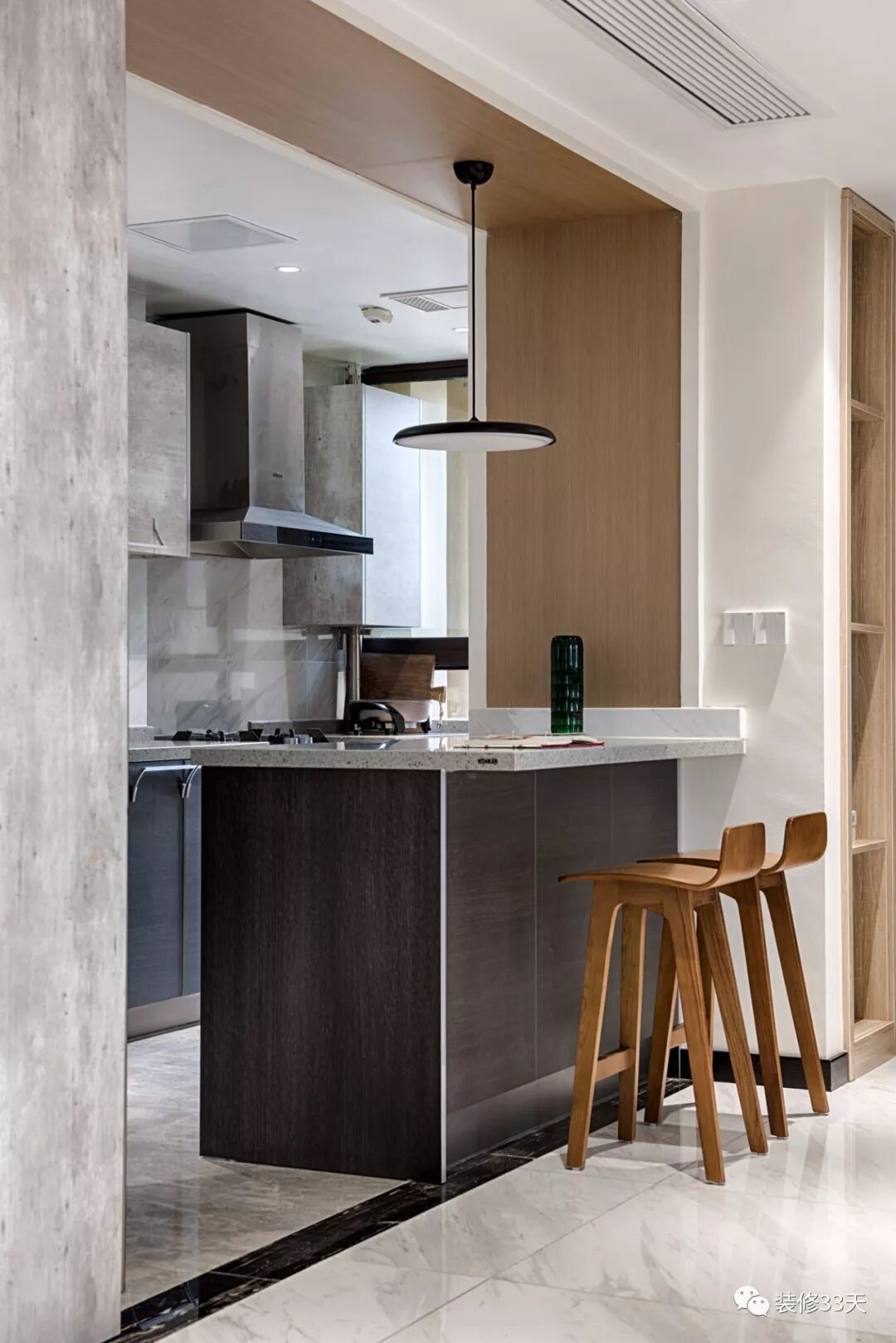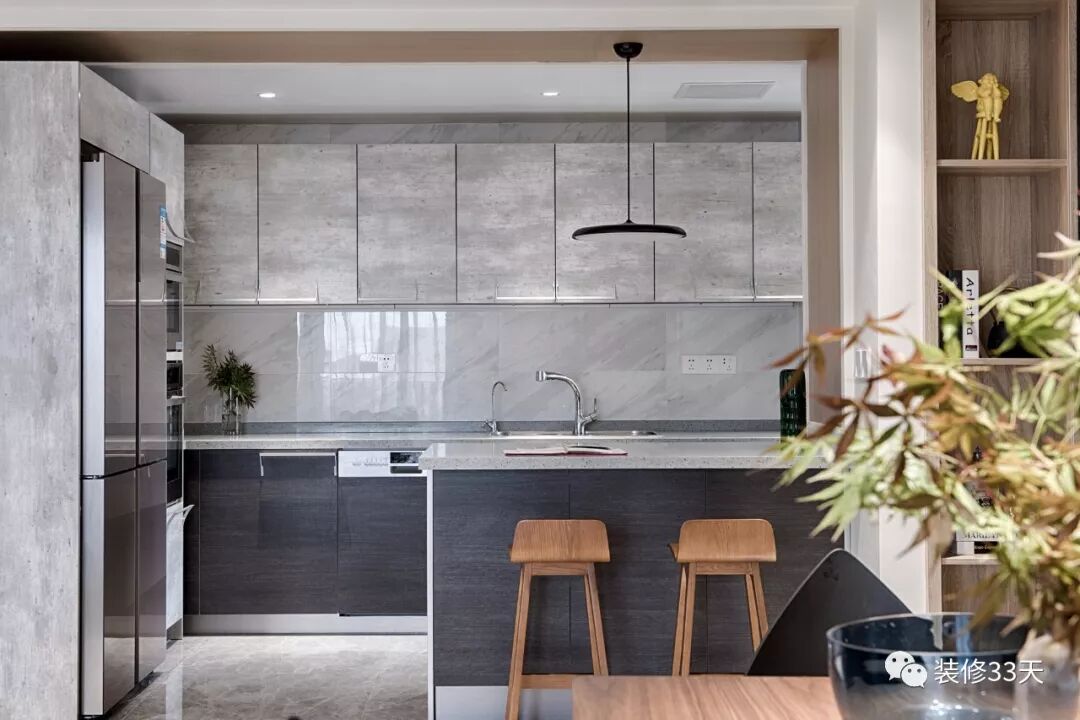 ▲ 厨房与公领域空间通过吧台作场域隔断,搭配两把木色吧台椅,简约中不乏自然色调