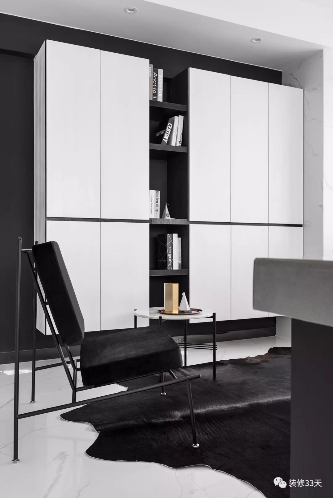 ▲ 一组悬空系统柜,结合储物与展示功能,黑白色调增添层次