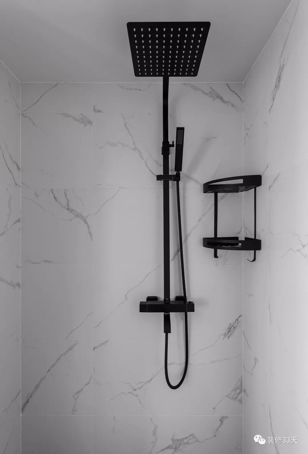 ▲ 淋浴区,仿大理石瓷砖搭配黑色花洒,风格与整室协调呼应