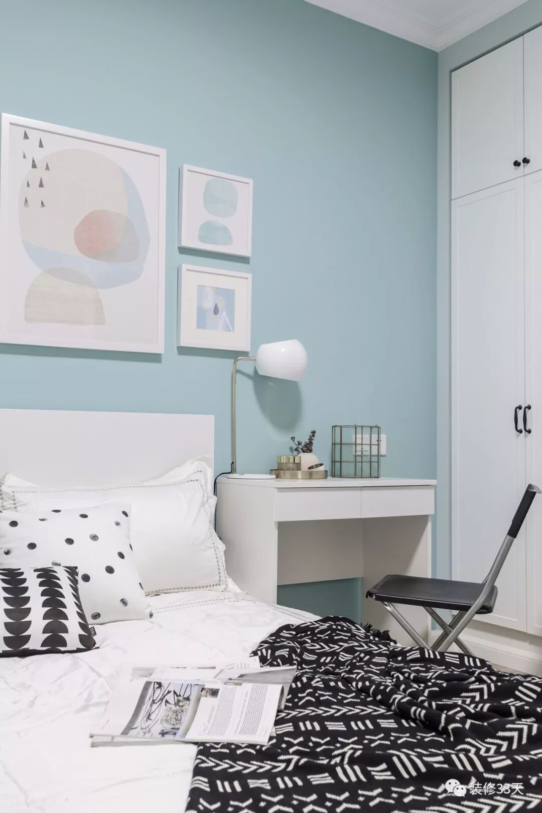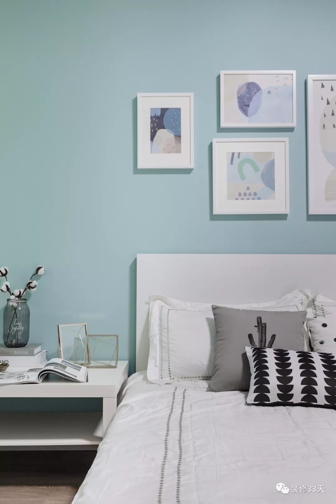 ▲ 次卧依然颜值不减,Tiffany色床背景点缀装饰画,原木家具搭配白色床品,给人轻松视觉感