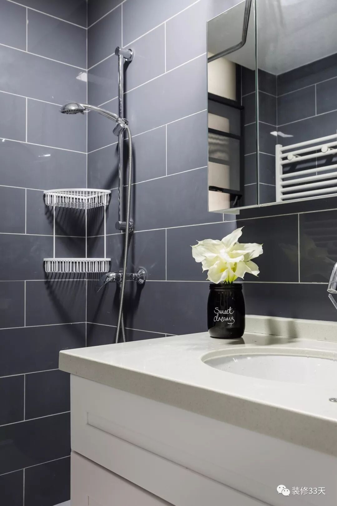 ▲ 主卫,以黑白灰为基调,工字铺地铁砖搭配绿植浴帘,经典而自然