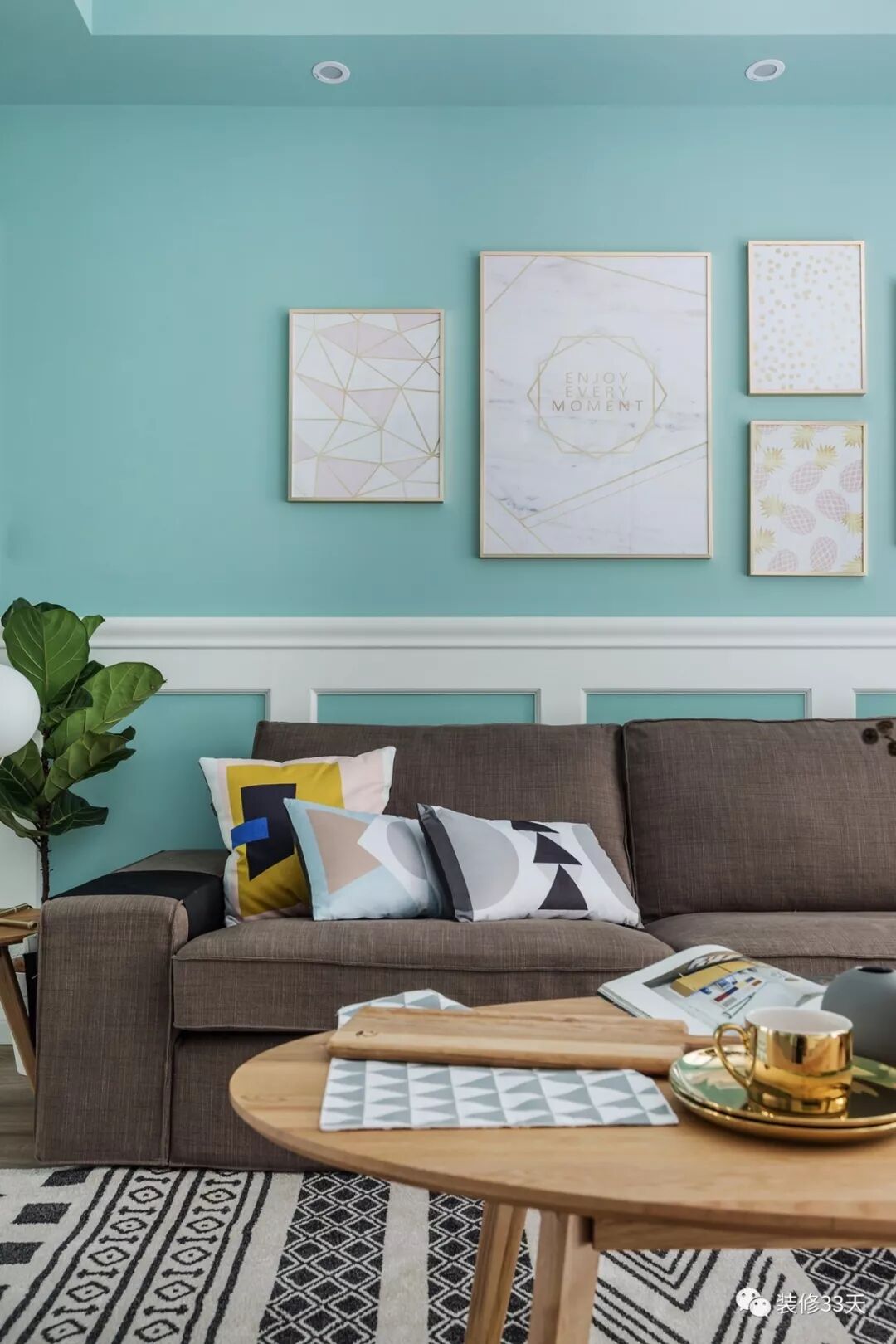 ▲ 大面积Tiffany蓝墙面点缀金框装饰画,咖啡色布艺沙发的加入稳定整体调性