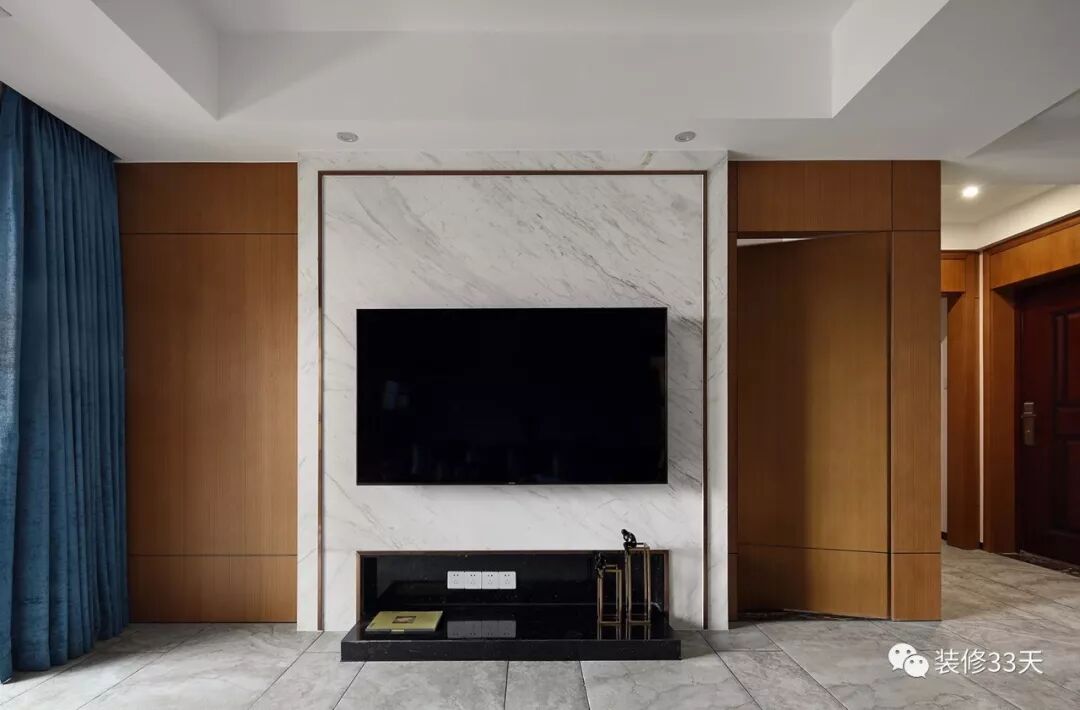 ▲ 大理石电视背景墙,金属边修饰,右侧隐藏次卧门片,与木质墙面浑然一体