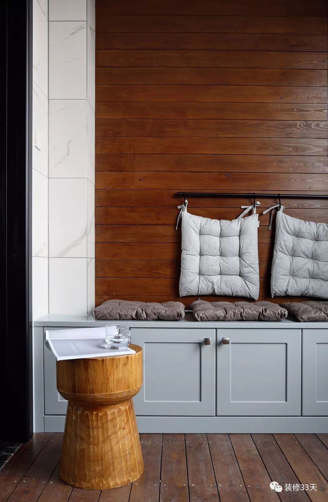 ▲ 在阳台铺设户外防腐木,木色延伸至卡座背景,蓝灰色卡座+软垫,完美打造休闲一隅