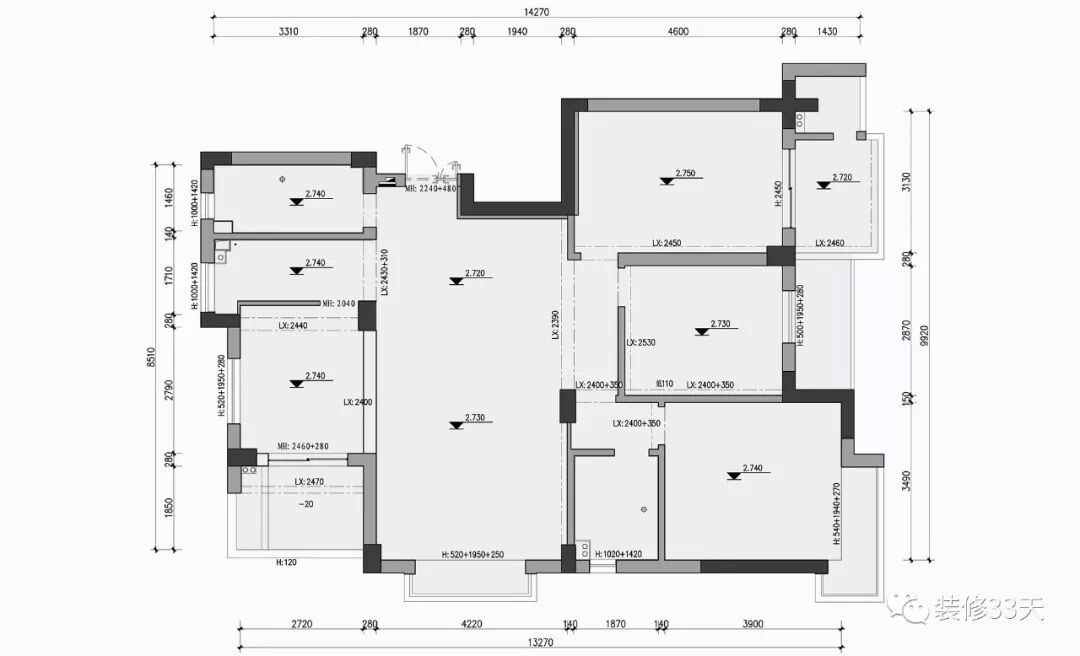 ▲ 建筑面积140平,整体以黑白灰低彩度基调点缀木色,石纹、墙纸等材质彰显质感实用的居家环境
