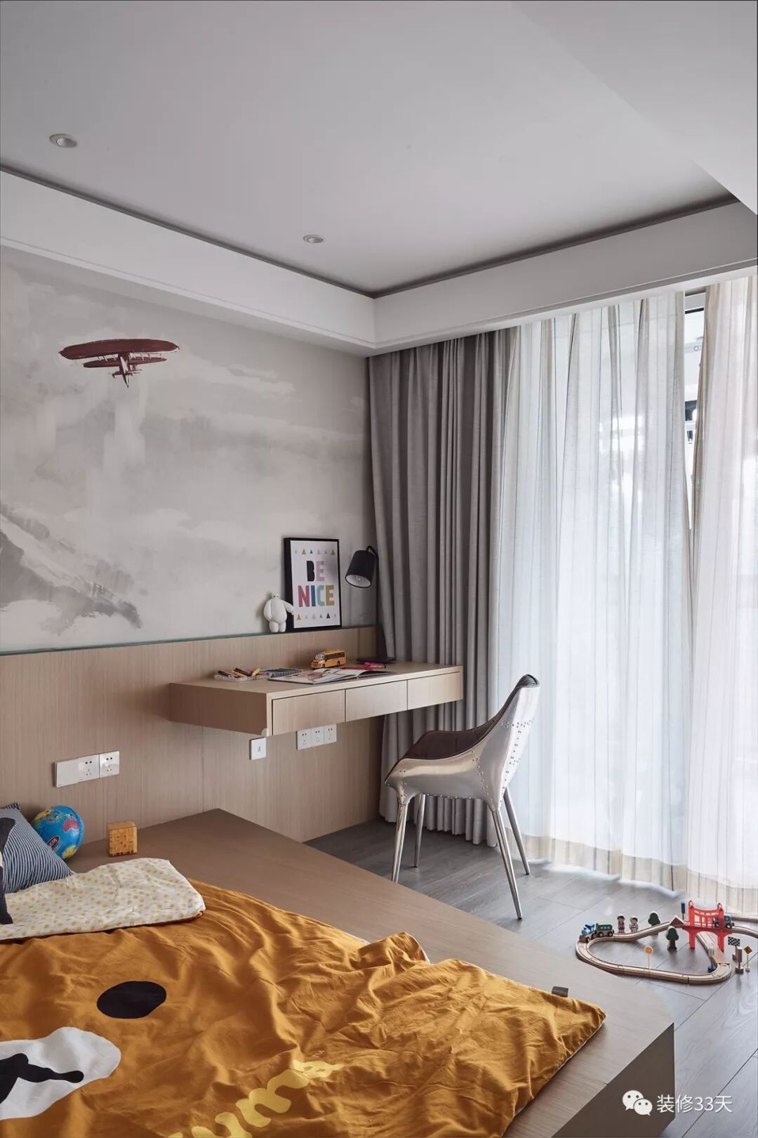 ▲ 儿童房,设计地台式床铺,半高木纹护墙作床靠,并延伸架空写字台