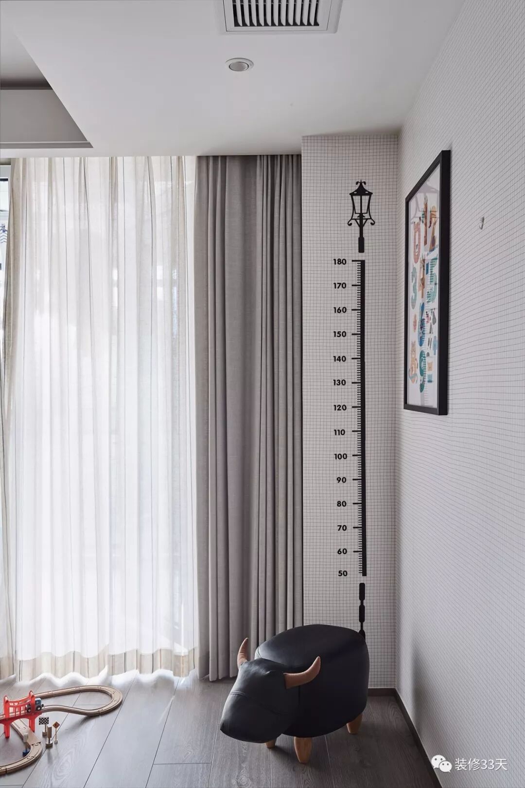 ▲ 儿童房另一面墙铺贴细格子墙纸,点缀装饰画与刻度尺,方便随时为孩子测量身高