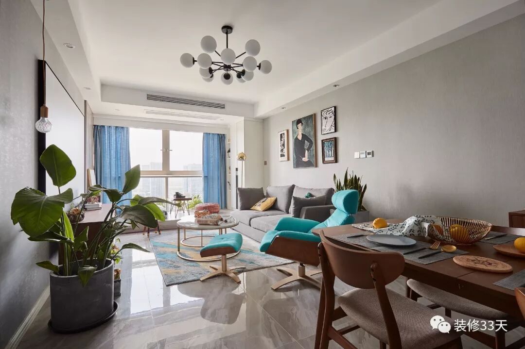 ▲ 客厅整体摈弃传统北欧的黑白灰,大胆使用最新流行色,让人眼前一亮