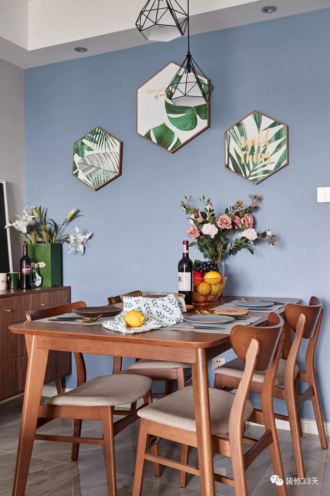 ▲ 餐厅,浅棕色木质餐桌椅,蓝灰色背景墙点缀多边形绿植挂画,营造一股原始的自然气息