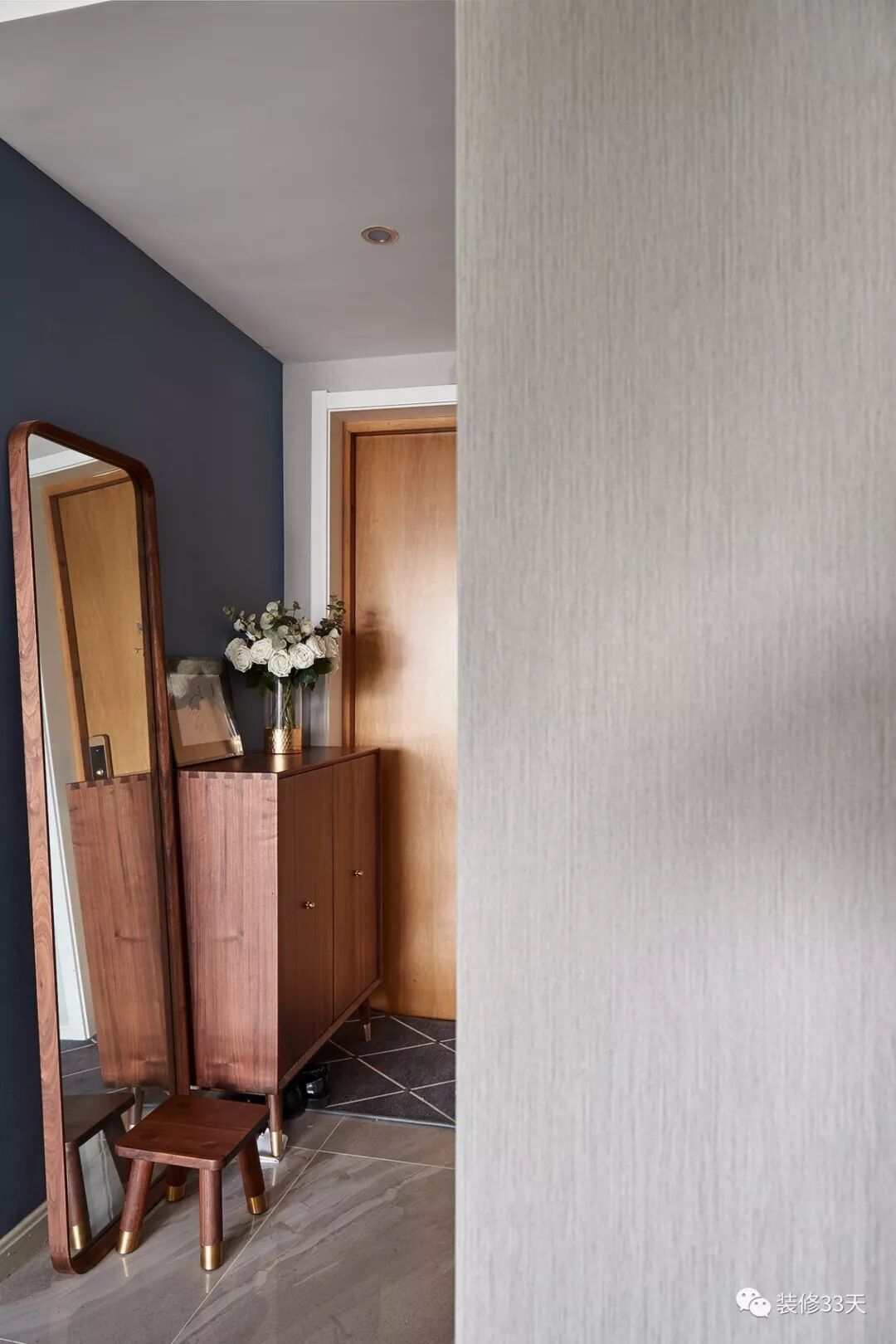 ▲ 建筑面积89平,半包8万,入门玄关处,浅棕色的玄关柜以及穿衣镜简单地修饰,一定程度上解决收纳问题