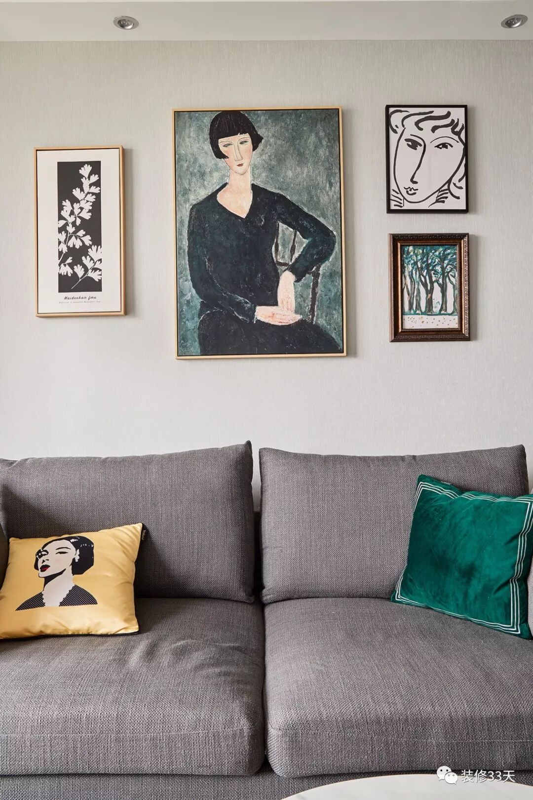 ▲ 浅灰色沙发放两个撞色靠枕,与背景墙的挂画一起制造出复古时尚的格调