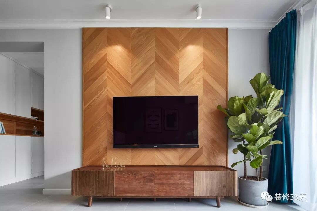 ▲ 用地板上墙做鱼骨拼,来当电视背景,效果还挺别致