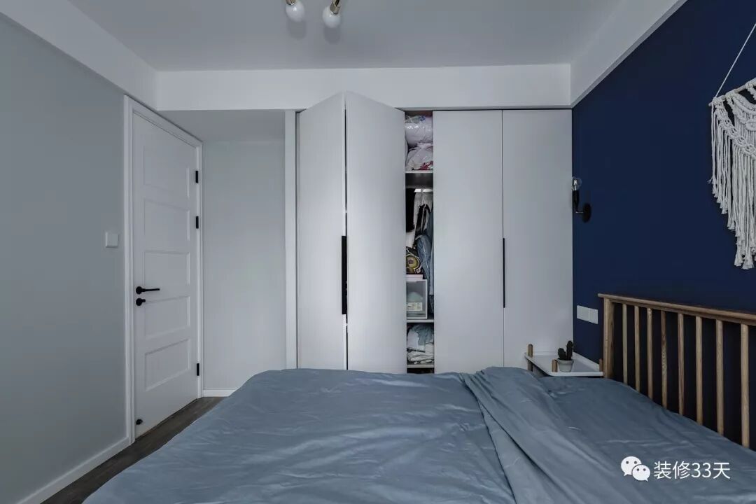 ▲ 主卧一面深邃蓝色背景,给与空间平静和坦然,搭配墙面挂件,让原本沉闷的背景充满生命力