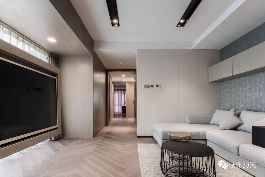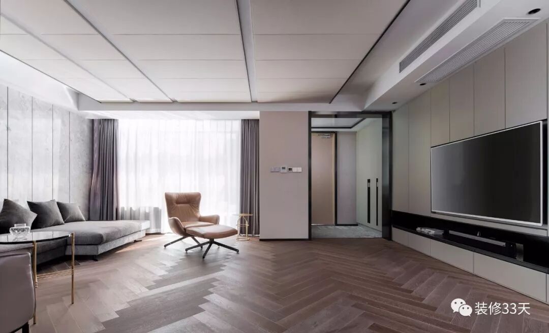 ▲ 二楼客厅在原有卧室墙体的外侧做一面简约嵌入式电视背景板,搭配人字型拼接地板与浅灰色沙发