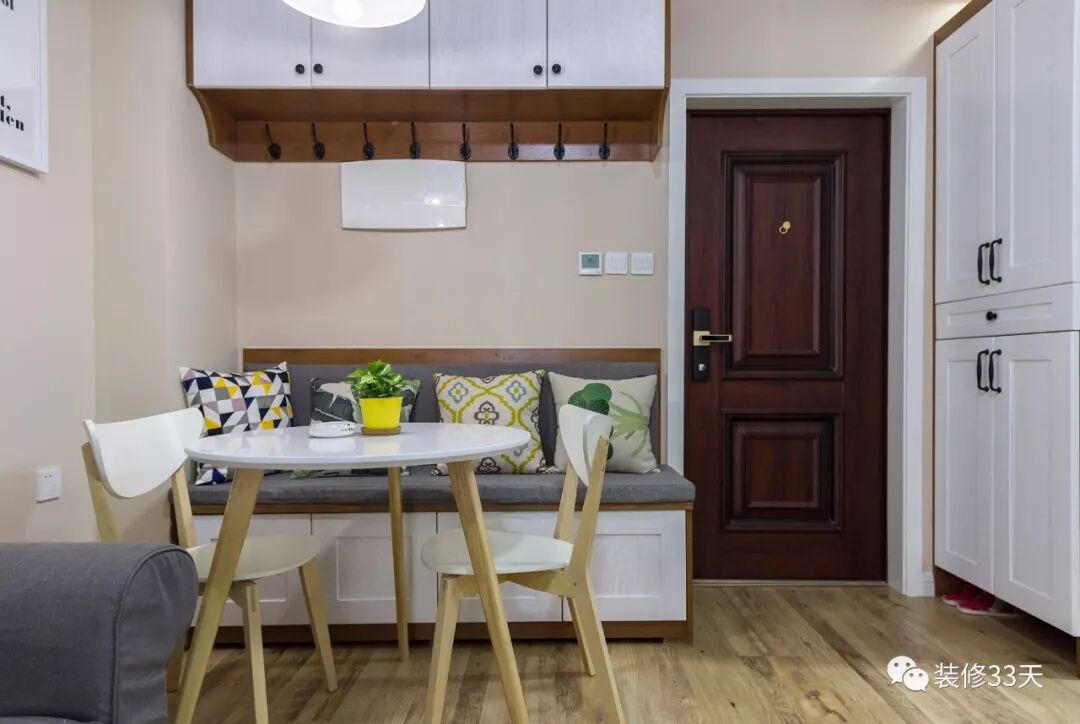 ▲ 入户右侧便是卡座式餐厅,卡座上方设计吊柜结合衣帽钩