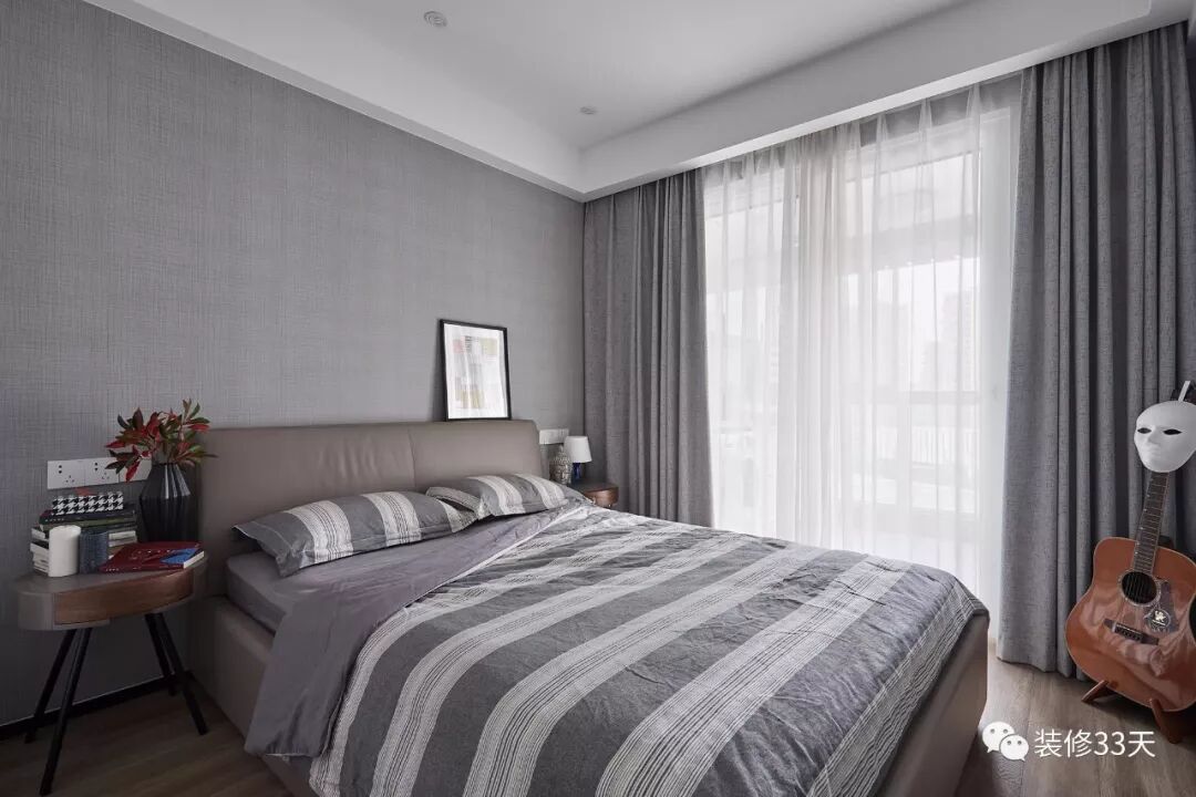 ▲ 次卧,木地板搭配灰色细纹壁纸背景墙,造型圆润的边柜与皮质大床提升空间品质