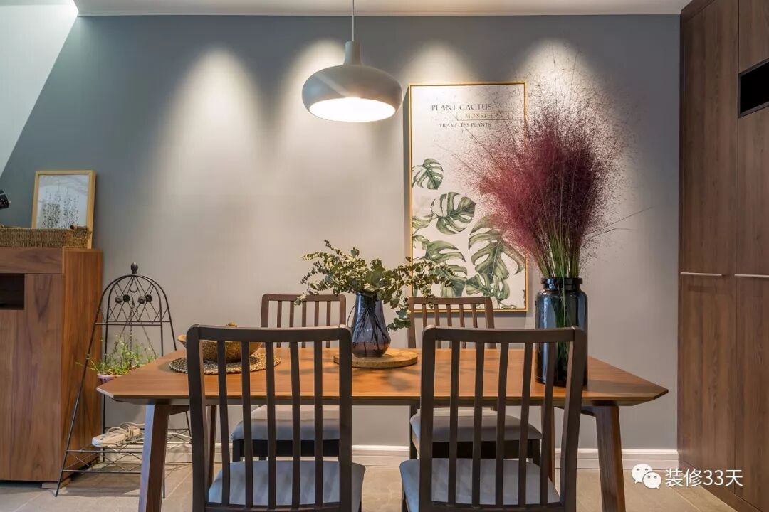 ▲ 餐厅,实木餐桌椅搭配灰色斜切背景墙,以装饰画与灯光作修饰