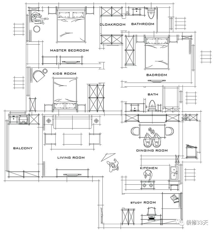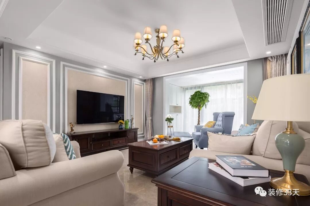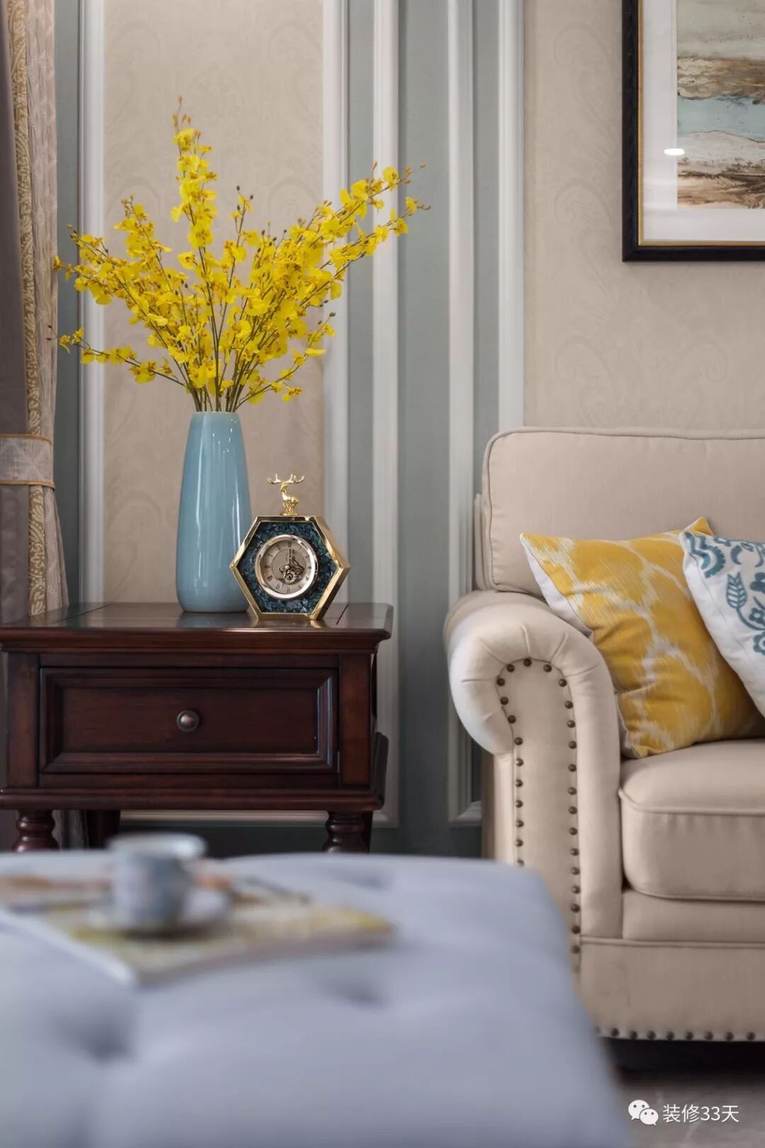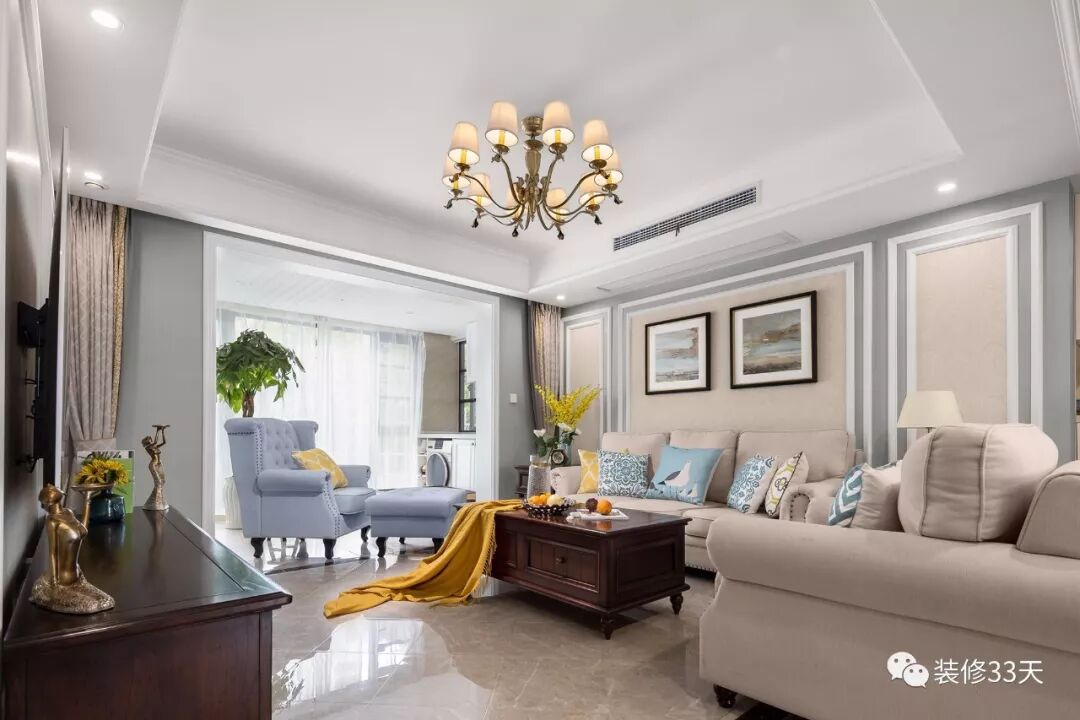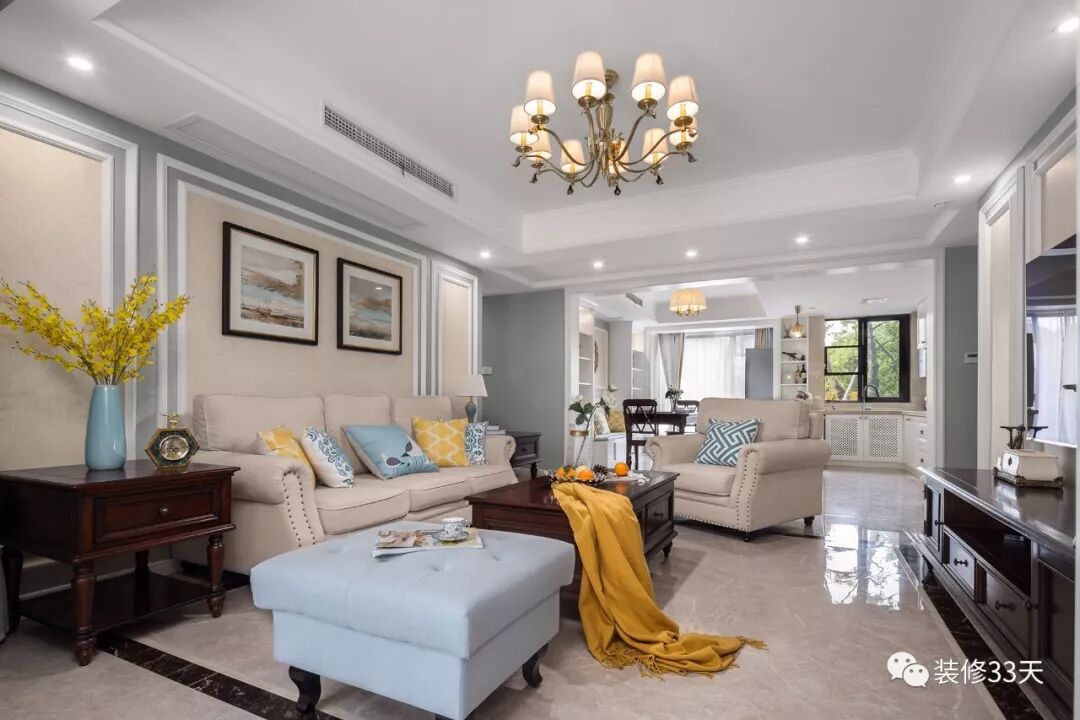 ▲ 建筑面积135平,总造价35万,客厅墙面铺贴尼罗河蓝墙纸,自带一种高级感,给现代美式增添一抹温情