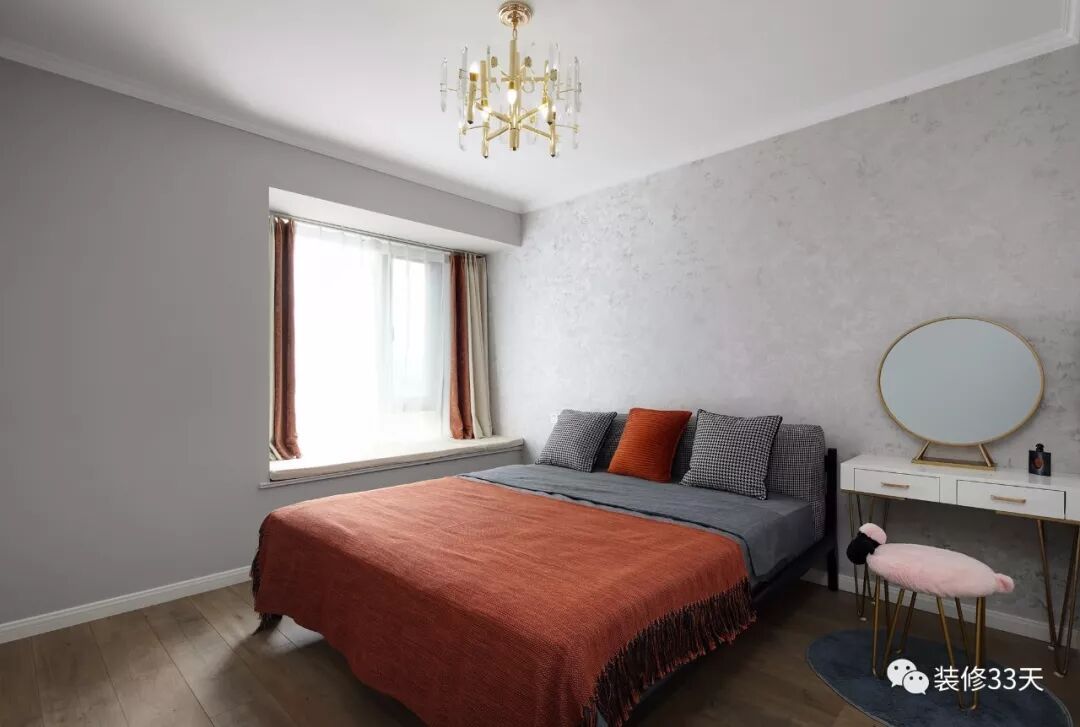 ▲ 主卧,木质地板搭配高级灰的空间,加入暖橘色点缀,床侧用梳妆台取代床头柜