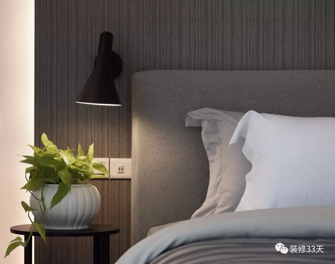 ▲ 黑白灰搭配竖纹壁纸,暖色壁灯营造就寝氛围
