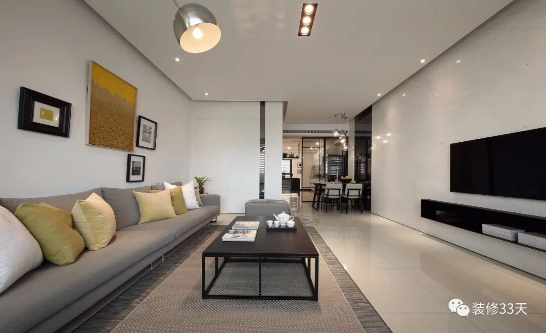 ▲ 工业风的茶几和黑色电视柜相配,顶级爵士白搭配灰镜设计,在纯白空间中彰显大气质感