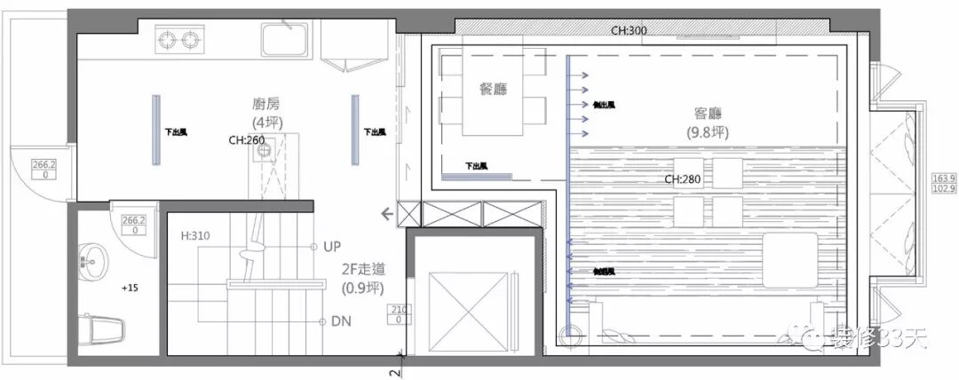 ▲ 进门左侧即为餐厅,现代风餐桌椅靠墙放置,造型吊灯与镜面背景,在视觉上延伸空间感